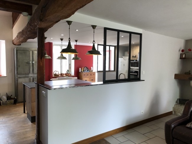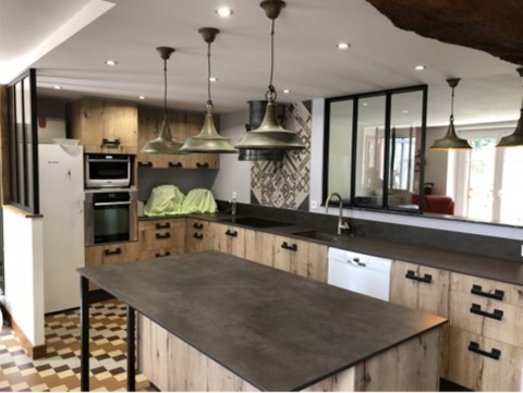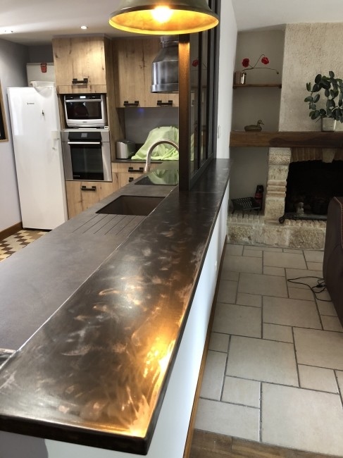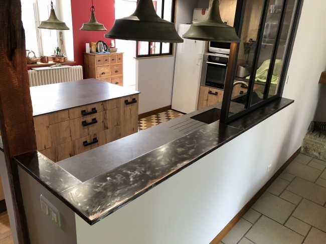 Verrières et comptoirs acier réalisées sur mesure pour une cuisine rénovée afin de donner et effet loft industriel.